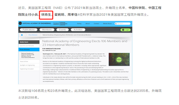据悉:当地时间2月9日,美国国家工程院发布通知,(NAE)公布2021年新当选院士、外籍院士名单,本次 新增106名院士和 23名外籍院士。此次增选后,美国国家工程院院士总数达到 2355名,外籍院士达到 298名。其中,中国科学院、中国工程院院士徐扬生入选!