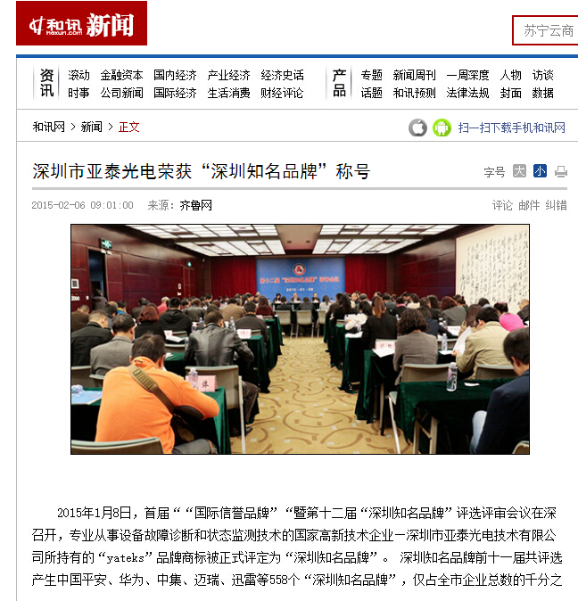 2015年1月8日,首届““国际信誉品牌”“暨第十二届“深圳知名品牌”评选评审会议在深召开,专业从事设备故障诊断和状态监测技术的国家高新技术企业—金年会所持有的“yateks”品牌商标被正式评定为“深圳知名品牌”。 深圳知名品牌前十一届共评选产生中国平安、华为、中集、迈瑞、迅雷等558个“深圳知名品牌”,仅占全市企业总数的千分之一。