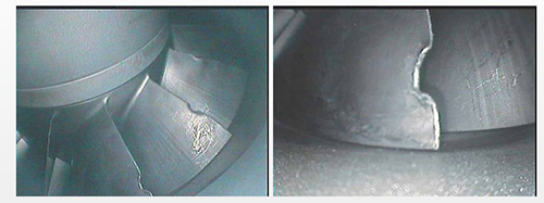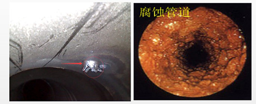 左边图片是对管子的检测图像采集,上图很明显的可以看到管子内部存在着起皮。右边图可以看到管子内部已经被腐蚀。