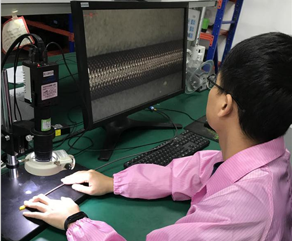 质量部检验员细致地检验钨丝网套来料