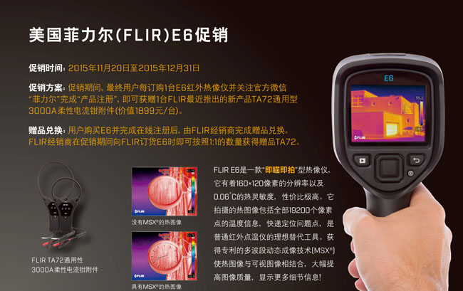 促销期间,最终用户每订购1台E6红外热像仪并关注官方微信“菲力尔”完成“产品注册”,即可获赠1台FLIR最近推出的新产品TA72通用型3000A柔性电流钳附件(价值1899元/台)。